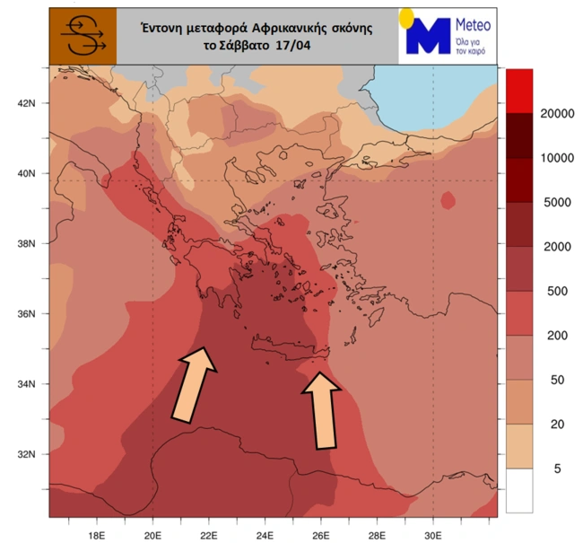 Παράλληλα, σύμφωνα με το προγνωστικό σύστημα DUSTMeteo του Εθνικού Αστεροσκοπείου Αθηνών/meteo.gr, λόγω της επικράτησης ανέμων νότιων διευθύνσεων στην ευρύτερη περιοχή της Ελλάδας, αναμένεται να εκδηλωθεί έντονη μεταφορά αφρικανικής σκόνης. Η ημέρα με τις μεγαλύτερες συγκεντρώσεις σκόνης θα είναι το Σάββατο.