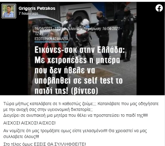 Τη στήριξή του, στην 49χρονη από τη Θεσσαλονίκη που αρνείται τα self-test σε μαθητές, και συνελήφθη για αντίστοιχες αναρτήσεις στο Facebook, εξέφρασε ο Γρηγόρης Πετράκος.
