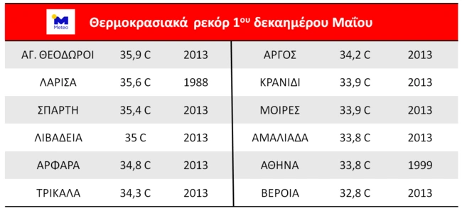 Τα πανελλαδικά θερμοκρασιακά ρεκόρ για το πρώτο δεκαήμερο του Μαΐου, σύμφωνα με μετεωρολογικούς σταθμούς της Εθνικής Μετεωρολογικής Υπηρεσίας και του Εθνικού Αστεροσκοπείου Αθηνών, ήταν το 2013 (Άγιοι Θεόδωροι 35,9 βαθμοί) και το 1988 (Λάρισα 35,6), ενώ στην Αθήνα η υψηλότερη θερμοκρασία για αρχές Μαΐου είχε καταγραφεί το 1999 (33,8 βαθμοί).