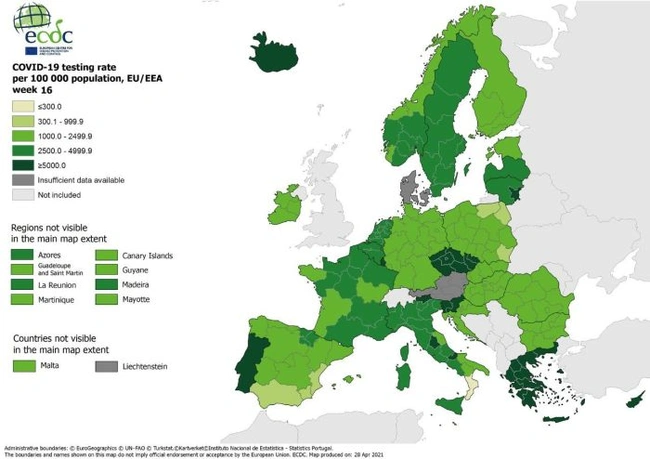 Στους νεότερους εβδομαδιαίους χάρτες του ECDC, αποτυπώνεται ότι η Ελλάδα βρίσκεται στο κορυφαίο επίπεδο στην Ευρώπη όσον αφορά τον αριθμό των τεστ (με περισσότερα από 5.000 ανά 100.000 κατοίκους) για τον κορονοϊό.
