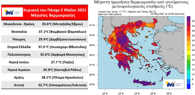 Οι θερμοκρασίες ρεκόρ καταγράφηκαν σε Μακεδονία, Θράκη, Θεσσαλία, Στερεά Ελλάδα και Πελοπόννησο, ενώ έσπασε και πάλι το ρεκόρ θερμοκρασίας που καταγράφηκε το Μεγάλο Σάββατο στην Κρήτη.