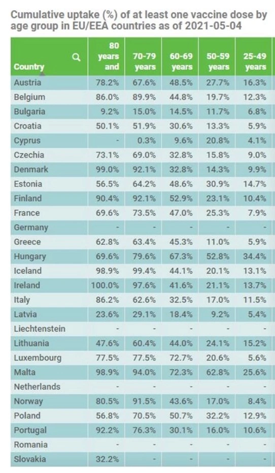 Η έκθεση του ECDC (European Centre for Disease Prevention and Control) αναφέρει τον χάρτη των εμβολιασμών για τον κορονοϊό σε όλες τις χώρες της Ευρωπαϊκής Ένωσης. Σύμφωνα με τα στοιχεία από την Ελλάδα, οι άνω των 70 και άνω δείχνουν απροθυμία να κάνουν το εμβόλιο. Τα στοιχεία συνοδεύονται από την ανακοίνωση της Ούρσουλα φον ντερ Λάιεν, ότι η ΕΕ ξεπέρασε τα 150 εκατομμύρια εμβολιασμούς, ενώ το 25% των πολιτών της έχει ήδη λάβει την πρώτη δόση.