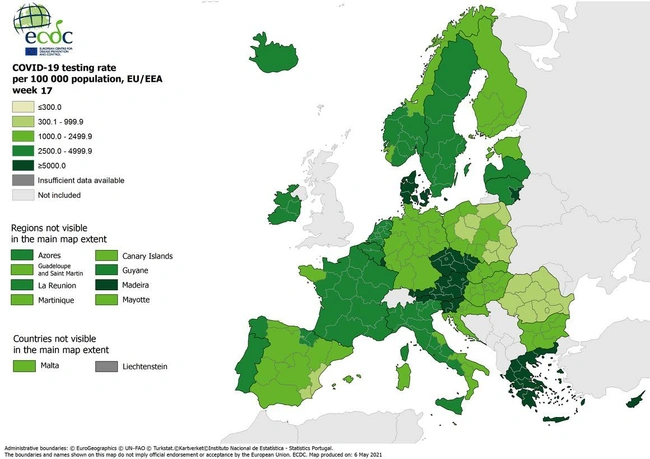 Ειδικότερα, σύμφωνα με τους νεότερους εβδομαδιαίους χάρτες του ECDC που δημοσιοποιήθηκαν σήμερα Πέμπτη (6/5), αποτυπώνεται ότι η Ελλάδα βρίσκεται σταθερά στην καλύτερη βαθμίδα όσον αφορά τα τεστ αναλογικά με τον πληθυσμό στην Ευρώπη (με περισσότερα από 5.000 ανά 100.000 κατοίκους) και στο «πράσινο» όσον αφορά στον δείκτη θετικότητας.