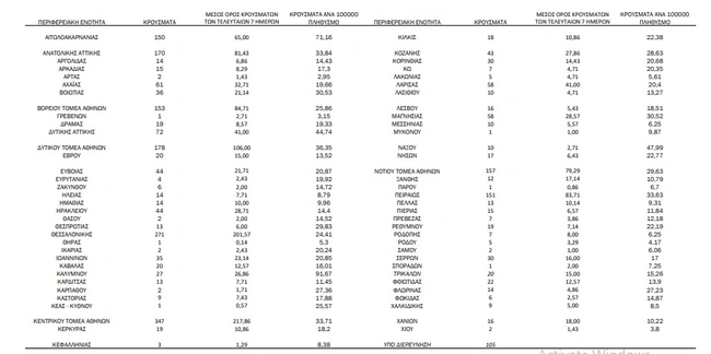 Παράλληλα, ιδιαίτερα υψηλός αριθμός κρουσμάτων εντοπίζεται στη Θεσσαλονίκη με 271, ενώ ακολουθεί η Αιτωλοακαρνανία (150), η Αχαΐα (61), η Λάρισα (58) και η Μαγνησία (58).
