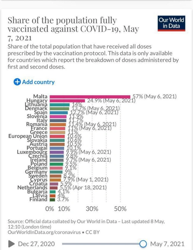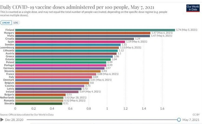Η Ελλάδα έχει ήδη εμβολιάσει και με τις δύο δόσεις του εμβολίου πάνω από το 11% του πληθυσμού της, όντας στην 10η θέση στην ΕΕ και πάνω από τον ευρωπαϊκό μέσο όρο.