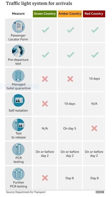 Υπενθυμίζεται ότι η Ελλάδα συνολικά έχει περιληφθεί στην «πορτοκαλί» ταξιδιωτική λίστα της βρετανικής κυβέρνησης, πράγμα το οποίο σημαίνει: Για τις αφίξεις στη Βρετανία από τις «πορτοκαλί» χώρες απαιτούνται μοριακά τεστ (PCR) πριν την αναχώρηση και τη δεύτερη και όγδοη ημέρα μετά από την άφιξη, μαζί με περίοδο απομόνωσης δέκα ημερών στο σπίτι. Οπως και τώρα, θα μπορεί κάποιος να σπάει την καραντίνα νωρίτερα εφόσον κάνει ένα πρόσθετο τεστ την πέμπτη ημέρα από την άφιξη στη Βρετανία.