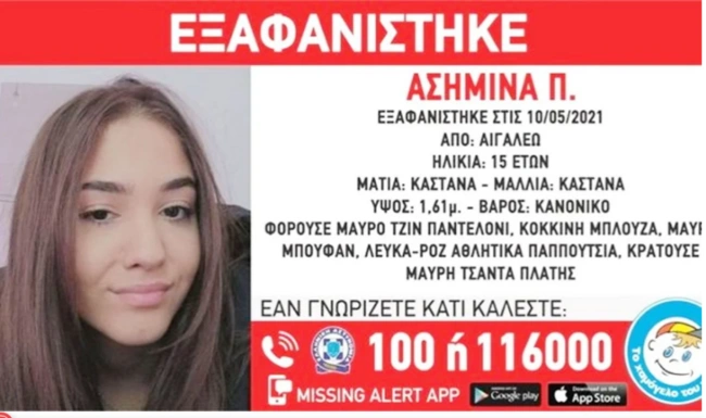 Την 15χρονη Aσημίνα που εξαφανίστηκε από το Αιγάλεω Αττικής αναζητά η οικογένειά της που την περιμένει πως και πως, και μετά από αίτημα της οικογένειας, το «Χαμόγελο του Παιδιού» δημοσιοποίησε τα στοιχεία της ανήλικης. Η 15χρονη τελευταία φορά εθεάθη να κινείται στην περιοχή του Αιγάλεω. Το ημερολόγιο έγραφε 10 Μαΐου. Εδώ και 3 ημέρες είναι άγνωστο πού βρίσκεται και η αγωνία για την τύχη της χτυπάει «κόκκινο».