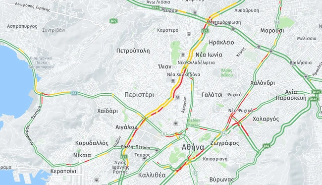 Δύσκολη και η κάθοδος της Κηφισιάς και της Μεσογείων με τα αυτοκίνητα κατά τμήματα να κινούνται με χαμηλές ταχύτητες. Αυξημένη κίνηση και στη λεωφόρο Αθηνών στο ρεύμα προς Κόρινθο από το Χαϊδάρι αλλά και στην κάθοδο της Βασιλίσσης Σοφίας προς το κέντρο της Αθήνας.