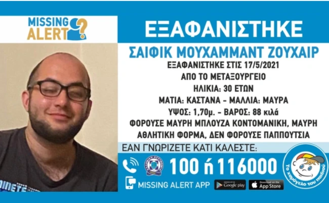 Ο Σαϊφίκ (επ.) Μουχαμμάντ Ζουχαίρ (ον.) έχει ύψος 1,70 μ., έχει 88 kg βάρος, έχει καστανά μαλλιά και μαύρα μάτια. Φορούσε μαύρη κοντομάνικη μπλούζα και μαύρη αθλητική φόρμα Οποιοσδήποτε έχει κάποια πληροφορία, παρακαλείται να επικοινωνήσει τηλεφωνικά με «Το Χαμόγελο του Παιδιού» όλο το 24ωρο, στην «Ευρωπαϊκή Γραμμή για τις Εξαφανίσεις», σε όλα τα Αστυνομικά Τμήματα της χώρας αλλά και μέσω της εφαρμογής MissingAlertapp οπού υπάρχει ζωντανή ενημέρωση για την εξαφάνιση.