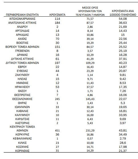 Αναλυτικά η κατανομή των κρουσμάτων σε όλη τη χώρα έχει ως εξής: