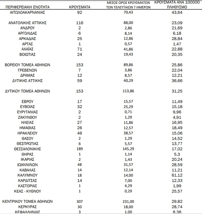 Αναλυτικά η κατανομή των κρουσμάτων σε όλη τη χώρα έχει ως εξής: