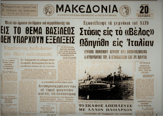 Την ίδια στιγμή, στην Ελλάδα, το όργανο της χούντας, η εφημερίδα «Ελεύθερος Κόσμος», δημοσιεύει σε έκτακτο παράρτημα: «Ο ήρως της γενόμενης ασχήμιας ήτο κυβερνήτης του Α/Τ "Βέλος". Το "Βέλος" δεν αποτελεί προσωπικήν ιδιοκτησίαν του κυρίου Γεωργίου Παπαδοπούλου. Ανήκει εις το έθνος. Και τας ημέρας αυτάς, το "Βέλος" συνέπραττε εις άσκησιν αποβλέπουσα εις την ασφάλειαν της Ελλάδος και των κρατών μελών του ΝΑΤΟ. Ο εν λόγω κύριος επρόδωσε και τα δύο καθήκοντα προς την πατρίδαν του και προς τη Συμμαχίαν, ως εντεταλμένος από τη χώρα κυβερνήτης του Α/Τ "Βέλος" […] Το ότι οι πρωταγωνιστές είναι προδότες και ριψάσπιδες προκύπτει εκ του γεγονότος ότι ούτοι ουδέν δικαιολογητικόν είχον, αφού η Επανάστασις έσωσεν την υστάτην στιγμήν το έθνος από το σιδηρούν παραπέτασμα και τον φυλετικόν αφανισμόν»!