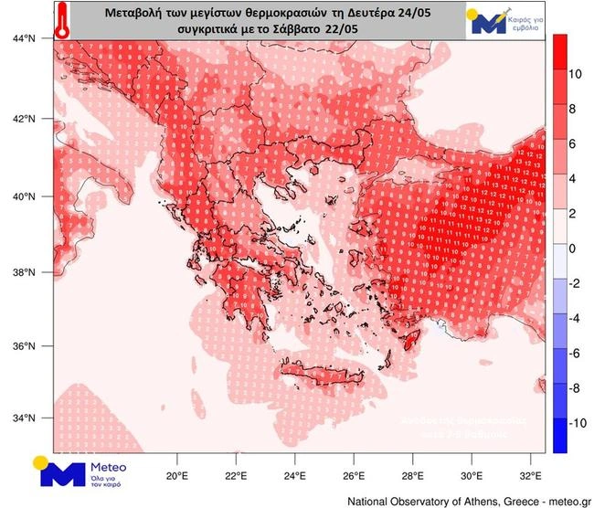 Όπως φαίνεται στον προγνωστικό χάρτη που ακολουθεί οι μέγιστες θερμοκρασίες τις μεσημεριανές ώρες της Δευτέρας 24/05 θα είναι κατά μέσο όρο 6-7 βαθμούς υψηλότερες σε σχέση με τις μέγιστες θερμοκρασίες του Σαββάτου 22/05, και εκτιμάται ότι θα φτάσουν τοπικά στους 35 βαθμούς Κελσίου.