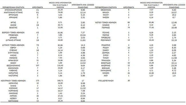 Οι περιφερειακές ενότητες με διψήφιο αριθμό κρουσμάτων