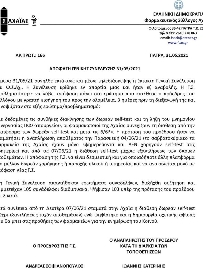 Η πρόταση του προέδρου του Φαρμακευτικού Συλλόγου Αχαΐας ήταν να σταματήσει η αναπλήρωση αποθέματος από τις 4 Ιουνίου και από τις 7 Ιουνίου η διάθεση self test μέχρι εξαντλήσεως των όποιων αποθεμάτων. Ψήφισαν 103 υπέρ και 2 κατά. «Κατά συνέπεια από τη Δευτέρα 7 Ιουνίου σταματά στην Αχαΐα η διάθεση δωρεάν self test (μέχρι εξαντλήσεως τυχόν αποθεμάτων ενώ ψηφίστηκε και η δημιουργία αφίσας που θα μπει στις προθήκες των φαρμακείων για την ενημέρωση του κοινού», καταλήγει η ανακοίνωση του Φαρμακευτικού Συλλόγου Αχαΐας.