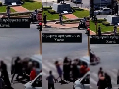 Ένα απίστευτο περιστατικό βίας κατέγραψε σε βίντεο που τράβηξε με την κάμερα του κινητού του τηλεφώνου κάποιος περαστικός, το μεσημέρι του Σαββάτου, 5 Ιουνίου στη διασταύρωση Κισσάμου και Μονής Γωνιάς στα Χανιά. Η καταγραφή του βίντεο ξεκινάει όταν ο καυγάς είναι ήδη σε εξέλιξη και δεν είναι σαφές ποιος την ξεκίνησε και γιατί.