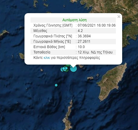 Σεισμός 4,2 βαθμών της κλίμακας Ρίχτερ σημειώθηκε στις 19:00 τη Δευτέρα 7 Ιουνίου στην Τήλο.
