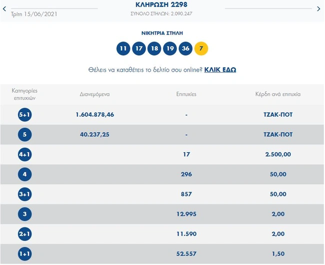 Οι τυχεροί αριθμοί είναι: 11, 17, 18, 19, 36 και Τζόκερ ο αριθμός: 7