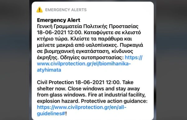 Μήνυμα στα κινητά των πολιτών της ευρύτερης περιοχής απέστειλε η Πολιτική Προστασία μέσω του 112, καλώντας τους να κλείσουν πόρτες και παράθυρα, και να παραμείνουν μακριά από υαλοπίνακες. Συγκεκριμένα το μήνυμα αναφέρει: «Καταφύγετε σε κλειστό κτήριο τώρα. Κλείστε τα παράθυρα και μείνετε μακριά από υαλοπίνακες. Πυρκαγιά σε βιομηχανική εγκατάσταση, κίνδυνος έκρηξης. Οδηγίες αυτοπροστασίας ΕΔΩ
