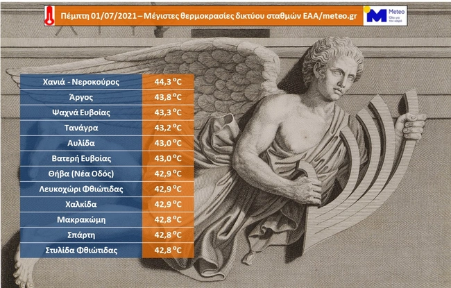 Οπως ανέφερε το Εθνικό Αστεροσκοπείο Αθηνών / meteo.gr, την Πέμπτη 01/07 οι μέγιστες θερμοκρασίες στα κεντρικά και νότια ηπειρωτικά θα έφταναν τοπικά τους 43-44 ⁰C και στα βόρεια ηπειρωτικά τους 37-38 ⁰C. Στα νησιωτικά τμήματα, οι θερμοκρασίες θα παρέμεναν σε υψηλά επίπεδα φτάνοντας στο Ανατολικό Αιγαίο και την Ανατολική Ρόδο τους 40-41 ⁰C, στην Κρήτη τους 39-40 ⁰C, στις Κυκλάδες τους 36-37 ⁰C και στο Ιόνιο τους 34-35 ⁰C.