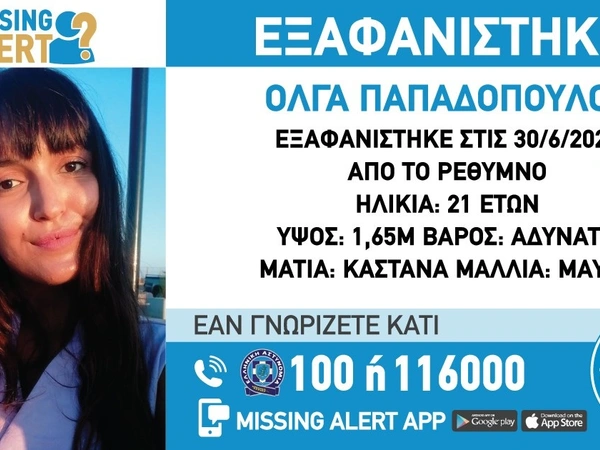 Συναγερμός έχει σημάνει στις Αρχές στο Ρέθυμνο λόγω της εξαφάνισης της 21χρονης Ολγας Παπαδοπούλου. Τα ίχνη της χάθηκαν χθες Τετάρτη (30/6).