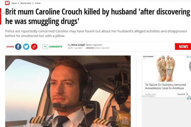 «Η ελληνική Αστυνομία φοβάται ότι ο σύζυγος της Βρετανής Καρολάιν Κράουτς τη σκότωσε αφού ανακάλυψε ότι χρησιμοποιούσε το ελικόπτερό του για διακίνηση ναρκωτικών πανίσχυρων καρτέλ» αναφέρει χαρακτηριστικά το δημοσίευμα του βρετανικού ταμπλόιντ.