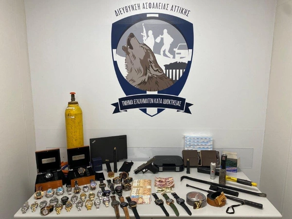 Στην κατοχή τους, καθώς και από τις έρευνες σε οικίες και χώρους, βρέθηκαν και κατασχέθηκαν φιάλη υγραερίου, ηλεκτρικά καλώδια, φυτίλια, πιστόλι, φυσίγγια, λοστοί, βαριοπούλα, μικροποσότητα κάνναβης, πλήθος ρολογιών, κινητά τηλέφωνα και κάρτες SIM.