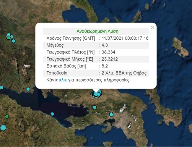 Σεισμός 4,3 βαθμών της κλίμακας Ρίχτερ σημειώθηκε στις 03:00 σε απόσταση 2 χιλιομέτρων βόρεια-βορειοανατολικά της Θήβας, όπως ανακοίνωσε το Γεωδυναμικό Ινστιτούτο του Εθνικού Αστεροσκοπείου Αθηνών, χαρακτηρίζοντάς τη «ασθενή». Η σεισμική δόνηση έγινε ιδιαίτερα αισθητή στην Αττική.
