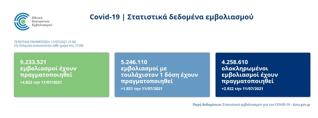Συνολικά αυτή τη στιγμή στην Ελλάδα έχουμε 5.246.110 εμβολιασμένους πολίτες. Από αυτούς τα 4.258.610 είναι πλήρως εμβολιασμένοι.