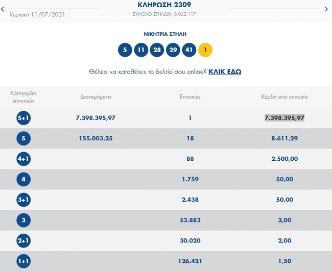 Σήμερα, Κυριακή 11 Ιουλίου 2021, στην κλήρωση 2309 του Τζόκερ του ΟΠΑΠ, οι τυχεροί της πρώτης κατηγορίας μοιράζονται τουλάχιστον 7.390.000 ευρώ.