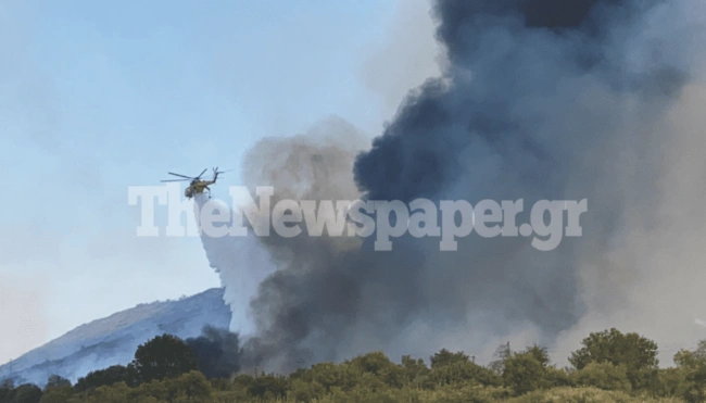 Η δεύτερη φωτιά καίει στην περιοχή Πετρομάγουλο Διμηνίου, καίει χαμηλή βλάστηση, ενώ στην κατάσβεσή της συμμετέχουν επίγεια και εναέρια μέσα, αφού το ελικόπτερο επιχειρεί και σε αυτή για να την περιορίσει άμεσα.