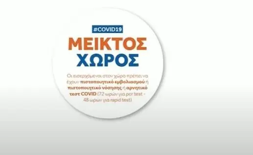 Στις επιχειρήσεις με αυτό το σήμα θα επιτρέπονται μόνο καθήμενοι πελάτες, ενώ στη διαμόρφωση του χώρου, η σήμανση θα προβλέπει ξεχωριστά τμήματα της επιχείρησης που θα μπορούν να κάθονται οι πελάτες, που θα έχουν εμβολιαστεί ή θα έχουν νοσήσει ή να έχουν κάνει τα προβλεπόμενα τεστ.