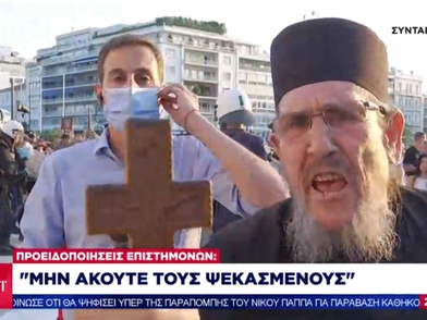Μάλιστα, κατά τη διάρκεια της συγκέντρωσης των αρνητών του εμβολίου, ένα απρόοπτο συνέβη στο δελτίο του ΣΚΑΪ όταν ένας ρασοφόρος με σταυρό άρχισε να αποδοκιμάζει και να μιλά «γαλλικά». Στην πλατεία Συντάγματος, μάλιστα, βρέθηκε ρεπόρτερ του ΣΚΑΪ, ο οποίος προσπάθησε να μεταδώσει την είδηση για τη συγκέντρωση των αντιεμβολιαστών. Οι αρνητές του εμβολίου, όμως, έκαναν διαρκώς παρέμβαση στο πλάνο με αποτέλεσμα να μην μπορεί να προχωρήσει το ρεπορτάζ ενώ ακούστηκαν και διάφορες αποδοκιμασίες όπως «προδότες». Κάποια στιγμή, μάλιστα, ένας ρασοφόρος που κρατούσε στο χέρι του έναν σταυρό, άρχισε να φωνάζει συνθήματα κατά του εμβολιασμού. Ακολουθεί το σχετικό βίντεο: