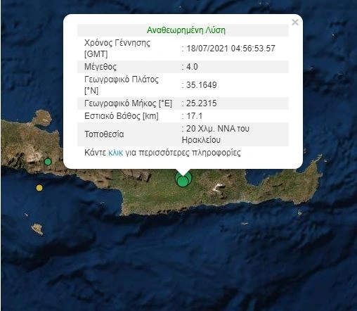 Ο σεισμός είχε επίκεντρο 21 χιλιόμετρα νότια από το Ηράκλειο και εστιακό βάθος 10 χλμ σύμφωνα με το Γεωδυναμικό Ινστιτούτο.