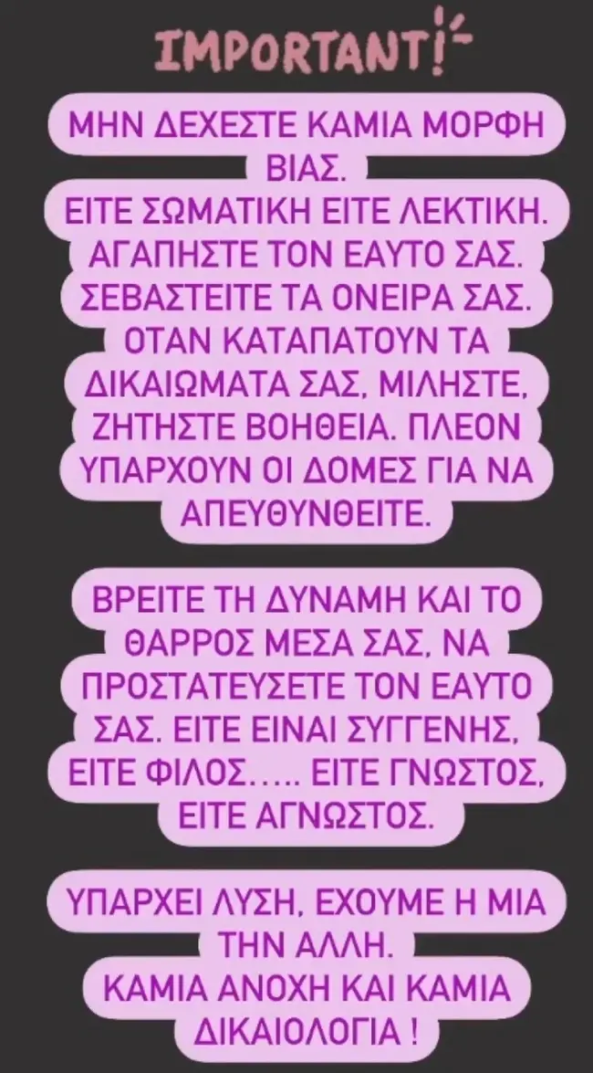 «Μη δέχεστε καμία μορφή βίας, είτε σωματική είτε λεκτική. Αγαπήστε τον εαυτό σας. Σεβαστείτε τα όνειρά σας. Όταν καταπατούν τα δικαιώματά σας, μιλήστε. Ζητήστε βοήθεια. Πλέον υπάρχουν οι δομές για να απευθυνθείτε. Βρείτε τη δύναμη και το θάρρος μέσα σας, να προστατεύσετε τον εαυτό σας. Είτε είναι συγγενής, είτε φίλος… είτε γνωστός, είτε άγνωστος. Υπάρχει λύση, έχουμε η μία την άλλη. Καμία ανοχή και καμία δικαιολογία!».
