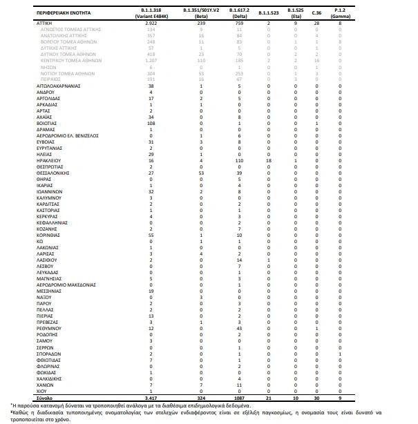 Εκ των 334 δειγμάτων με στελέχη ειδικού ενδιαφέροντος, τα 219 αφορούν στο στέλεχος Delta, 97 αφορούν στο Alpha, 16 αφορούν στο Βeta και 2 αφορούν στο Gamma. Εκ των 21 δειγμάτων με στελέχη υπό παρακολούθηση, όλα αφορούν στο στέλεχος B.1.1.318.