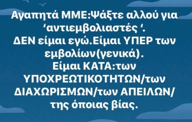 Οπως αναφέρει ο Μέμος Μπεγνής, δεν είναι κατά του εμβολίου αλλά τάσσεται κατά της υποχρεωτικότητας του εμβολιασμού. Μάλιστα, με τη νέα του ανάρτηση ο ηθοποιός θέλει να κάνει σαφές ότι διαφωνεί με την υποχρεωτικότητα αλλά όχι με τον εμβολιασμό. Ειδικότερα, ο Μέμος Μπεγνής δημοσιεύει στο Instagram του μια ιστορία, στην οποία γράφει το εξής μήνυμα: «Αγαπητά ΜΜΕ: Ψάξτε αλλού για «αντιεμβολιαστές». ΔΕΝ είμαι εγώ. Είμαι ΥΠΕΡ των εμβολίων (γενικά). Είμαι ΚΑΤΑ: των ΥΠΕΧΡΕΩΤΙΚΟΤΗΤΩΝ/ των ΔΙΑΧΩΡΙΣΜΩΝ/ των ΑΠΕΙΛΩΝ/ της όποιας βίας».