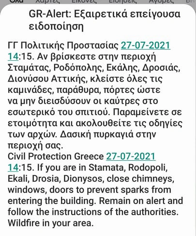 Λίγο μετά τις 2 το μεσημέρι εστάλη και νέο μήνυμα από την πολιτική προστασία με οδηγίες για τους πολίτες.