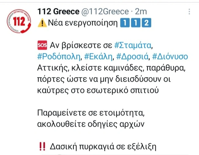 Είναι η δεύτερη φορά μέσα σε λίγες ώρες που ενεργοποιήθηκε το 112 για τη φωτιά που ξέσπασε το πρωί της Τρίτης στη Σταμάτα. Την πρώτη φορά καλούσε τους κατοίκους της περιοχής να παραμείνουν σε ετοιμότητα και να ακολουθούν πιστά τις οδηγίες των Αρχών.