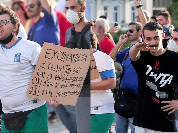 Κρατώντας ελληνικές σημαίες, πανό και φωνάζοντας συνθήματα συγκεντρώθηκαν στην πάνω πλευρά της πλατείας Συντάγματος. Μάλιστα, κάποιοι από τους διαδηλωτές χαιρετούσαν ναζιστικά προς τις κάμερες και τον φωτογραφικό φακό.
