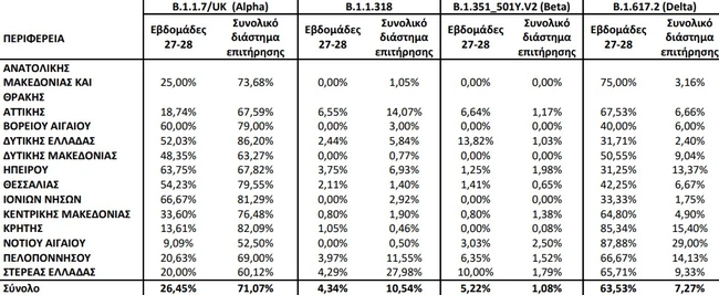 Από τον παραπάνω πίνακα είναι επίσης εμφανές ότι Κρήτη και Νότιο Αιγαίο πλήττονται περισσότερο από τη μετάλλαξη Δέλτα με ποσοστά 85,34% και 87,88%, αντίστοιχα. Σε πιο αναλυτικά πίνακα του ΕΟΔΥ με τον απόλυτο αριθμός κρουσμάτων (ανεξαρτήτως τρόπου δειγματοληψίας) με στελέχη αυξημένου ενδιαφέροντος που χρήζουν άμεσης λήψης μέτρων ελέγχου, ανά Περιφερειακή Ενότητα, για το χρονικό διάστημα από την έναρξη λειτουργίας του Εθνικού Δικτύου Γονιδιωματικής Επιτήρησης του ιού SARS-CoV-2 μέχρι σήμερα, το Ηράκλειο είναι... πρωταθλητής στη μετάλλαξη Δέλτα με 150 λοιμώξεις, ενώ η Αττική έχει .1516 κρούσματα με μετάλλαξη Δέλτα. Συνολικά από τα 3.496 κρούσματα που ελέχθηκαν τα 2.426 ήταν με το στέλεχος της μετάλλαξης Δέλτα.