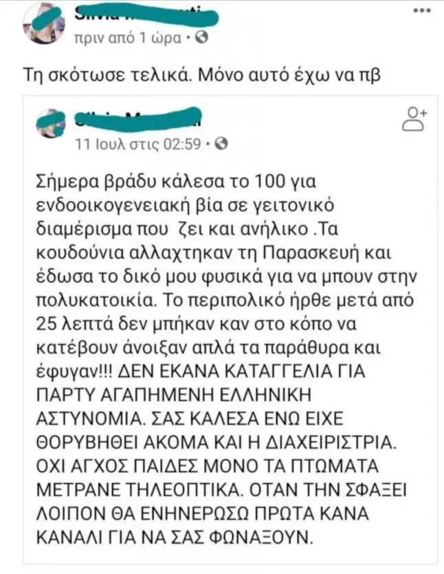 «Σήμερα το βράδυ κάλεσα το 100 για ενδοοικογενειακή βία σε γειτονικό διαμέρισμα, που ζει και ανήλικο. Τα κουδούνια αλλάχτηκαν την Παρασκευή και έδωσα το δικό μου φυσικά για να μπουν στην πολυκατοικία. Το περιπολικό ήρθε μετά από 25 λεπτά, δεν μπήκαν καν στον κόπο να κατέβουν, άνοιξαν απλά τα παράθυρα και έφυγαν!», είχε γράψει γειτόνισσα σε ανάρτησή της, την οποία αναδημοσίευσε μετά τη δολοφονία, σχολιάζοντας: «Τη σκότωσε τελικά. Μόνο αυτό έχω να πω».