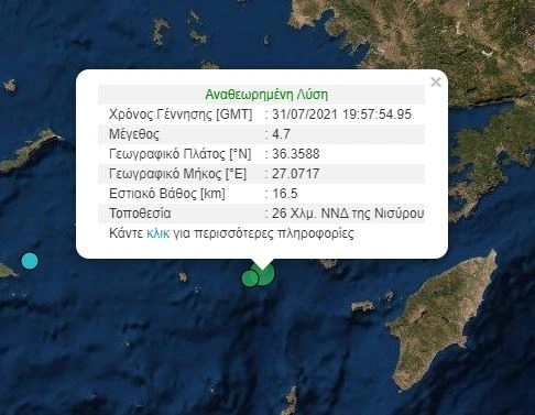 Σεισμός μεγέθους 4,7 βαθμών της κλίμακας Ρίχτερ έγινε στις 22.57 το βράδυ του Σαββάτου στα Δωδεκάνησα.