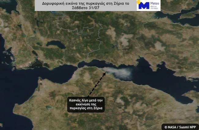 Δορυφορική εικόνα από τον δορυφόρο Suomi NPP της NASA λίγο μετά την εκκίνηση της πυρκαγιάς στη Ζήρια, Αχαΐας το Σάββατο 31/07.
