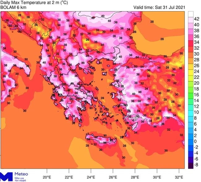 Όσον αφορά στην σημερινή μέρα, σύμφωνα με τα προγνωστικά στοιχεία του Εθνικού Αστεροσκοπείου Αθηνών αναμένονται μέγιστες θερμοκρασίες 42 έως 43 βαθμών Κελσίου κατά μέσο όρο. Στον προγνωστικό χάρτη που ακολουθεί αποτυπώνονται οι εκτιμώμενες μέγιστες θερμοκρασίες με την πιο λευκή απόχρωση να αντιστοιχεί σε θερμοκρασίες μεγαλύτερες των 42 βαθμών Κελσίου.