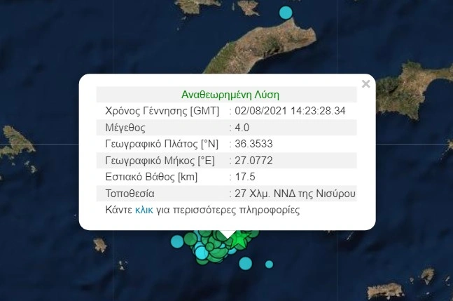 Νέος σεισμός ισχύος 4 βαθμών της κλίμακας Ρίχτερ σημειώθηκε στις 16:23 το απόγευμα της Δευτέρας (2/8) στην θαλάσσια περιοχή της Νισύρου, σύμφωνα με το Γεωδυναμικό Ινστιτούτο. Ο σεισμός αποτελεί συνέχεια της σεισμικής δραστηριότητας που αναπτύσσεται στην ευρύτερη περιοχή της Νισύρου στην διάρκεια των τελευταίων ημερών, η οποία παρακολουθείται από τους σεισμολόγους.