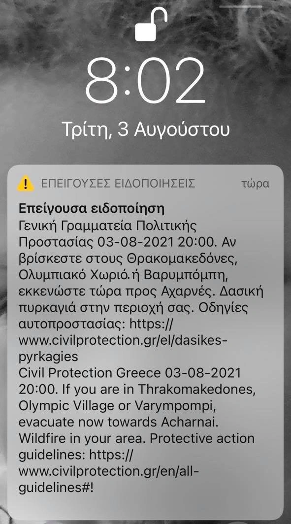 Μήνυμα να εκκενωθούν το Ολυμπιακό Χωριό, η Βαρυμπόμπη και οι Θρακομακεδόνες έλαβαν και πάλι όσοι βρίσκονται στην περιοχή της φωτιάς που άρχισε από τη Βαρυμπόμπη.