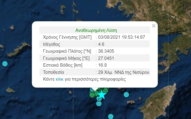 Νέος ισχυρός σεισμός σημειώθηκε στις 22:53 το βράδυ της Τρίτης (3/8) στα Δωδεκάνησα. Η σεισμική δόνηση είχε μέγεθος 4,6 βαθμών της κλίμακας Ρίχτερ με επίκεντρο 29 χιλιόμετρα νότια, νοτιοδυτικά της Νισύρου, ενώ είχε εστιακό βάθος 16,8 χιλιόμετρα, σύμφωνα με το Γεωδυναμικό Ινστιτούτο.