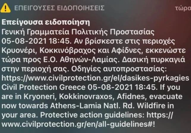 Νωρίτερα εστάλη νέο μήνυμα από το 112 προς τους κατοίκους της Δροσοπηγής. «Αν βρίσκεστε στη Δροσοπηγή εκκενώστε τώρα προς Αθήνα από Ε.Ο. Αθηνών_Λαμίας», τονίζει μεταξύ άλλων το 112.