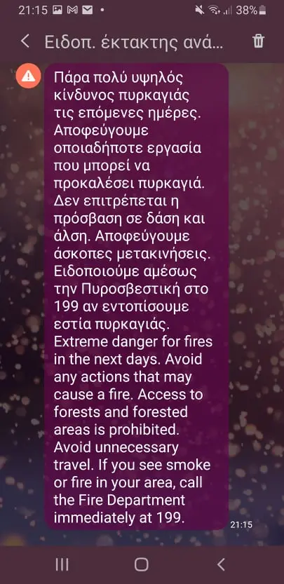 Ο αριθμός έκτακτης ανάγκης 112 έστειλε μήνυμα στους πολίτες προειδοποιώντας πως είναι πολύ υψηλός ο κίνδυνος εκδήλωσης φωτιάς τις επόμενες μέρες. «Αποφεύγουμε οποιαδήποτε εργασία που μπορεί να προκαλέσει πυρκαγιά. Δεν επιτρέπεται η πρόσβαση σε δάση και άλση. Αποφεύγουμε άσκοπες μετακινήσεις. Ειδοποιούμε αμέσως την Πυροσβεστική στο 199 αν εντοπίσουμε εστία πυρκαγιάς».